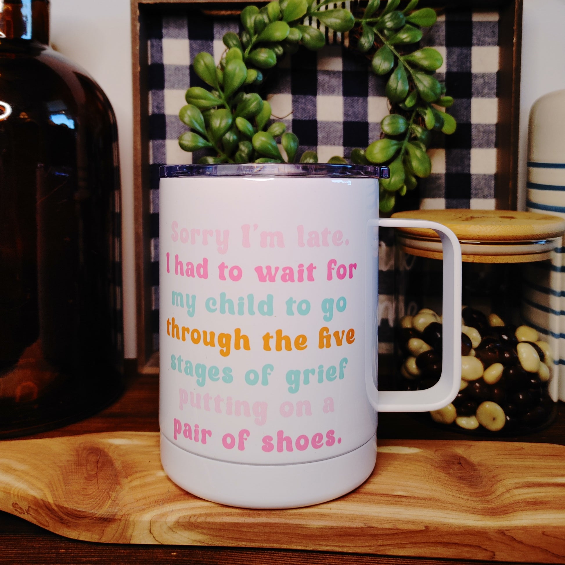 These travel mugs are made from stainless steel, and have a permanent image. Even though these are deemed top rack dishwasher safe, we recommend that you hand wash these to leave a lasting effect and to avoid any rusting if cups are left in the dishwasher. Holds 12 oz. Vacuum sealed plastic lid with a hole in the top. Image is printed on both sides. This travel mug has a handle.