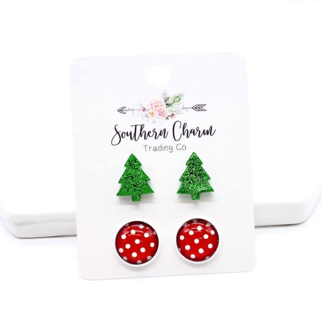 These little trees are absolutely adorable! The perfect shade of green and amount of sparkle. We can't overlook the adorable white and red polka dot studs either. This beautiful pair can easily transition right through Christmas and into Valentine's Day.