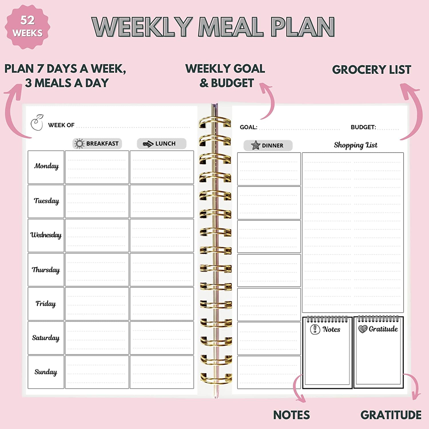- 52-week double spread weekly layout: breakfast, lunch and dinner